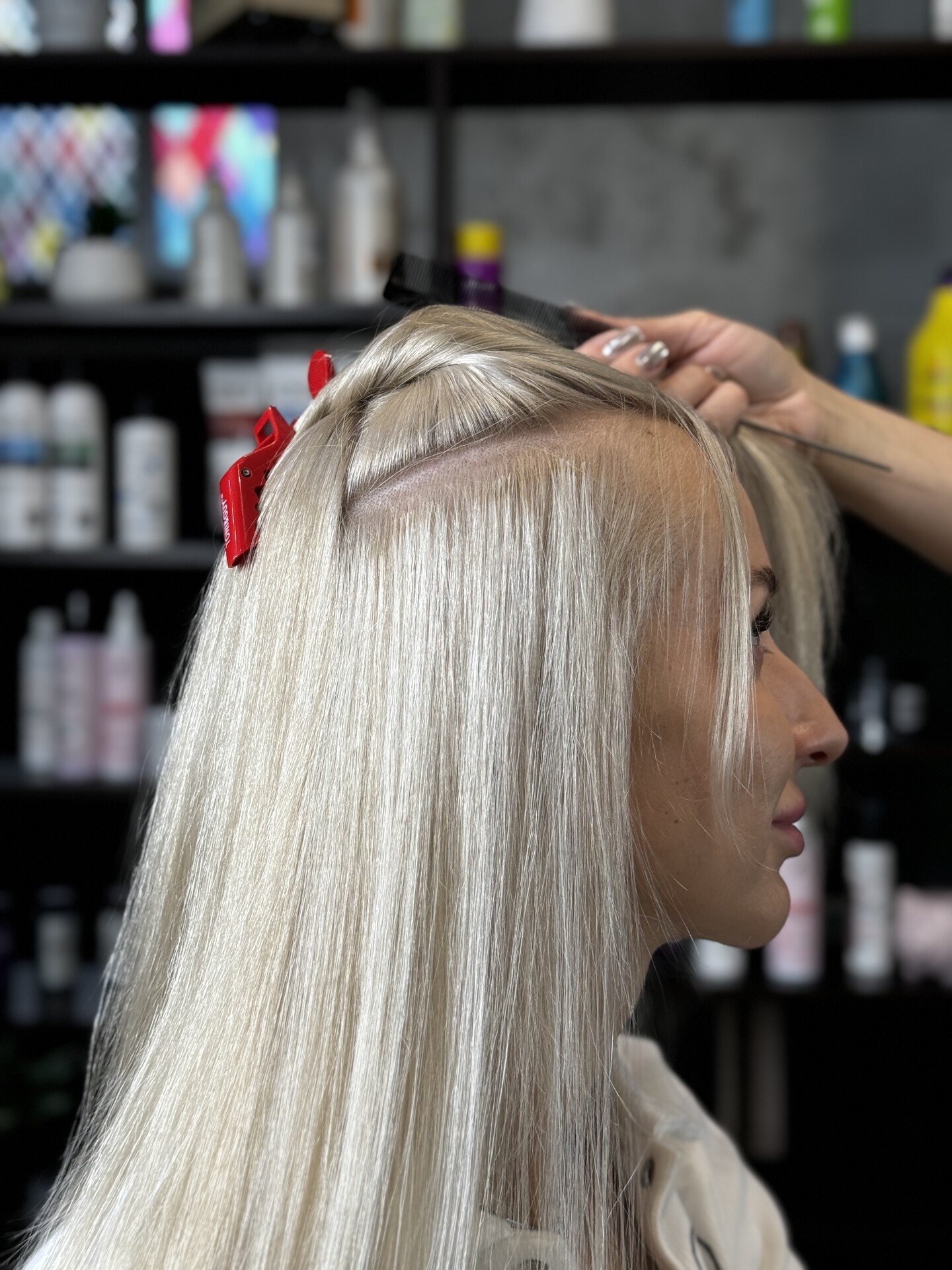 Колористика наращенных волос, растяжка на блонде, мелирование